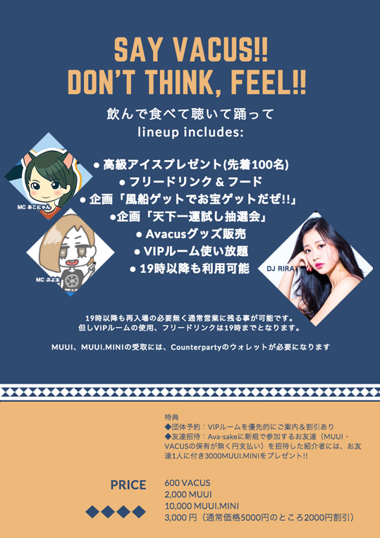 ◆Ava-sakeに新規で参加するお友達(MUUI・VACUSの保有が無く円支払いのお友達)を招待した紹介者には、お友達1人に付き3000MUUI.MINIをプレゼント!!